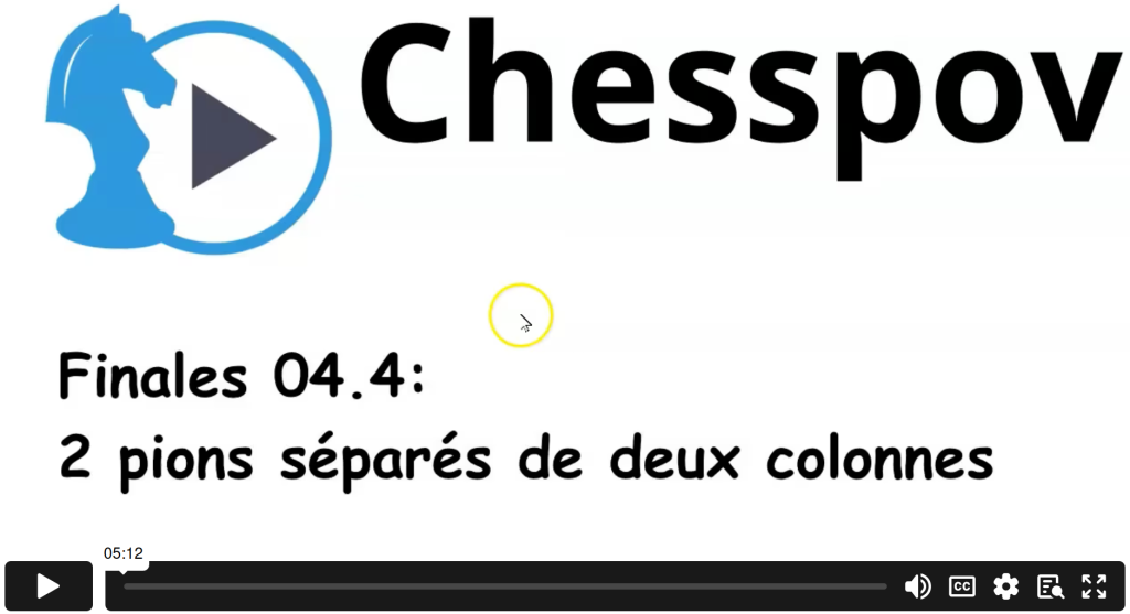 Dans ce cours d’échecs en vidéo, nous allons voir le cas sensible des finales avec deux pions séparés de deux colonnes sans soutien immédiat du Roi.