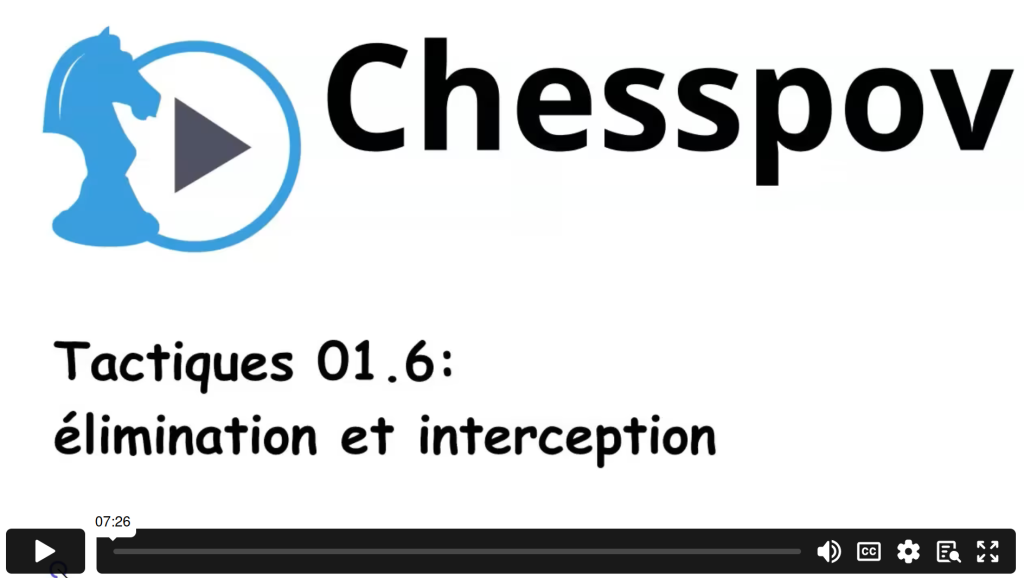 Dans ce cours d’échecs en vidéo sur les outils tactiques, nous allons voir l’élimination et l’interception qui consiste à supprimer un défenseur ou interposer une pièce pour intercepter l’action d’un défenseur.